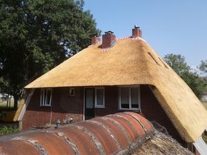 Een 2 onder 1 kap jaren 30 woning voorzien van een nieuwe rieten dak. Bij deze woning hebben we de loodslabben rondom de schoorsteen vervangen door rietvorsten.